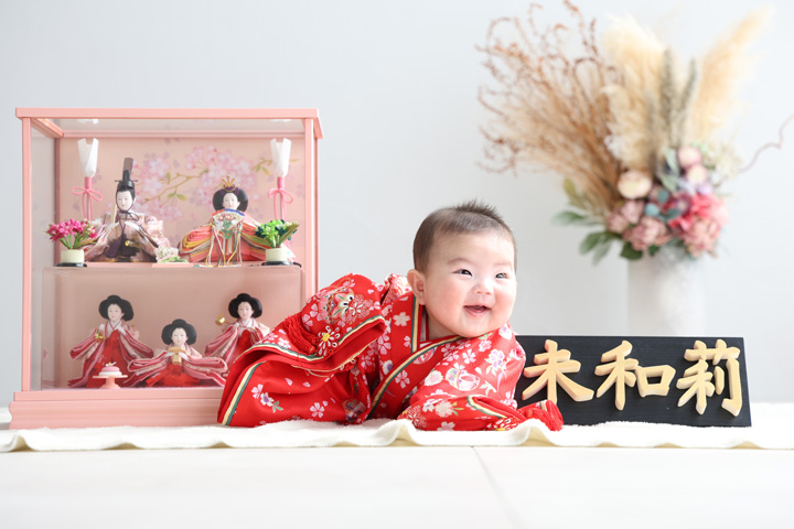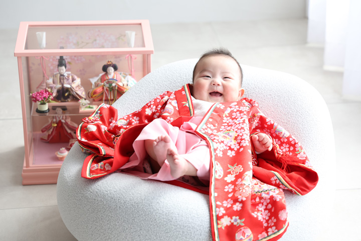 桃の節句 2026年3月16日衣装レンタル, 記念日nakamura 初節句記念写真です♪ ご持参されたお雛様と一緒に♪ とっても可愛いですね〜♪ すっごくごきげんです♪ ドアップの可愛さ、半端ないです♪笑 これからも元気に成長してくださいね♪ ご来店、誠にありがとうございました~♪
