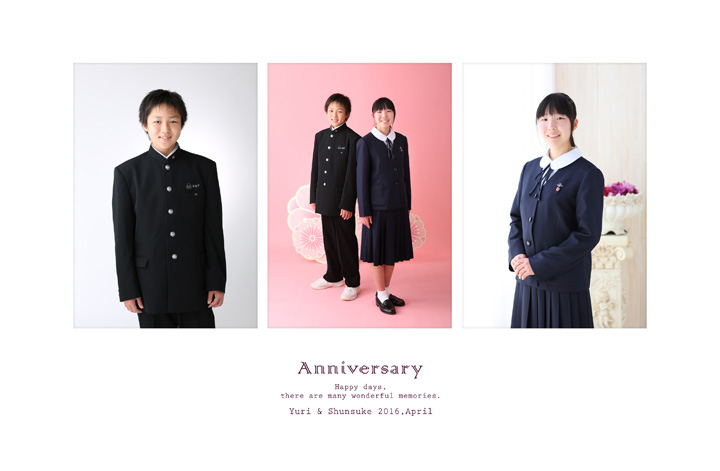 ゆりさんと、しゅんすけ君の入学祝い 2016年4月29日入園・卒園・入学nakamura ゆりさんと、しゅんすけ君の入学祝い記念写真です♪ ゆりさんは、高校へ入学! しゅんすけ君は中学校へ入学! 新しい制服姿の姉弟写真が、バッチリ撮れました♪ ふたりともハニカミながらも、自然で、素敵な笑顔を見せてくれましたよ~♪ 入学おめでとうございます!! これからも、いろいろな事に頑張ってくださいね~☆ ご来店、誠にありがとうございました~☆