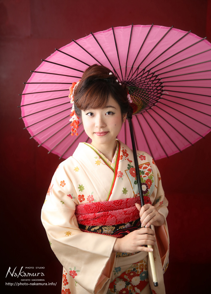 かよこさんの成人式 2015年10月17日成人式nakamura かよこさんの成人式前撮り写真です♪ お着物は、お母様の振袖ということでしたが、かよこさんにもとっても似合ってらっしゃいました~♪ 傘を持ったポーズも、おすまし笑顔も素敵ですね! ヘアメイク・着付けは、国分の美容室CUBEさんで、上品で可愛らしくセットされてました~☆ ご来店、誠にありがとうございました~☆