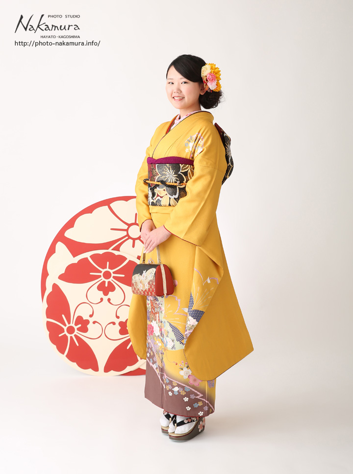 はつなさんの成人式 2015年12月21日成人式, 衣装レンタルnakamura はつなさんの成人式前撮り写真です♪ 当店のレンタル振袖「からし御所車」がとっても似合ってました~♪ 髪飾り等のコーディネートもバッチリ! 着物に合わせて、ネイルもしてきてくださり、素敵でした~☆ ご来店、誠にありがとうございました~☆