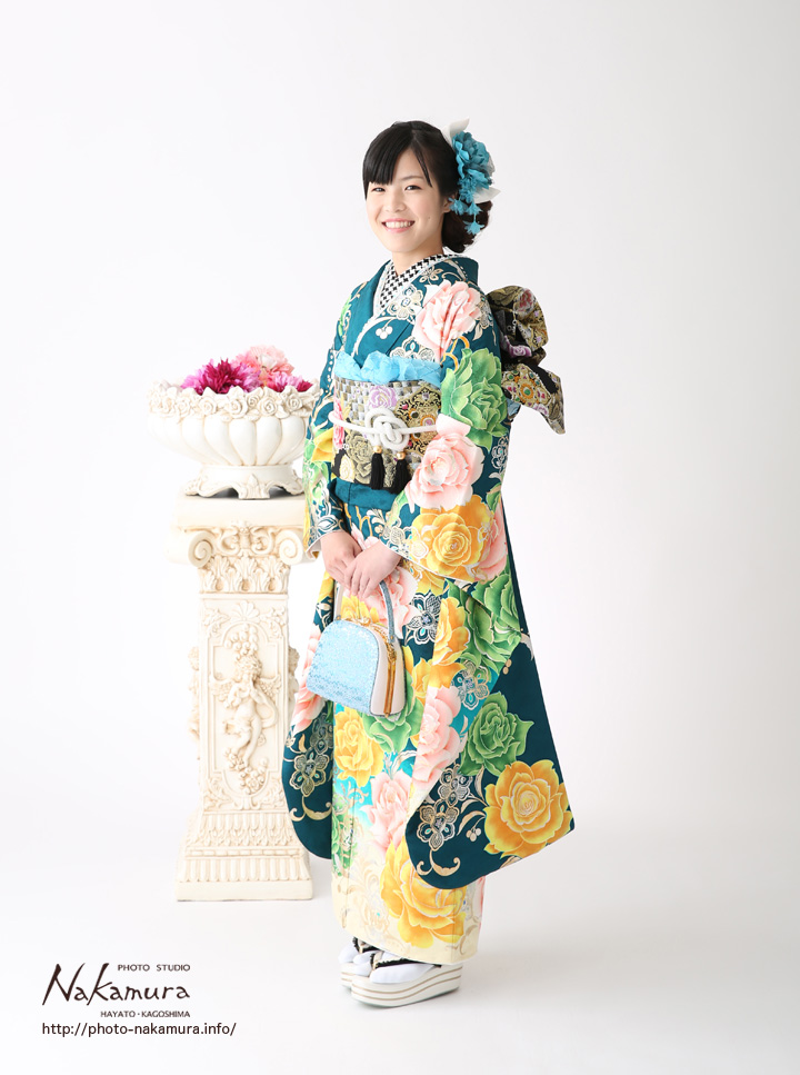 当店のレンタル振袖「コバルトグリーンローズ」がとっても似合ってました~♪